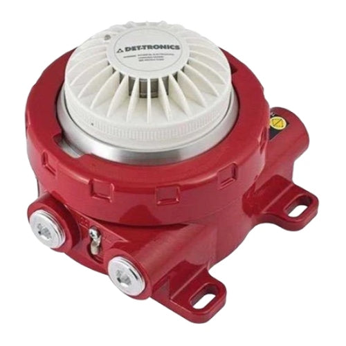 The Det-Tronics 30-3013A1N12F is an explosion-proof smoke detector designed for use in hazardous locations. It features a photoelectric sensing chamber, providing reliable detection of smoldering and rapidly growing fires. The device operates within a voltage range of 12 to 30 VDC and includes 0–20 mA analog output, Form C relay contacts, and a localized LED indicator. Its housing is constructed from aluminum, and it supports 1/2" NPT conduit connections. This model is suitable for both Division and Zone rated hazardous environments.